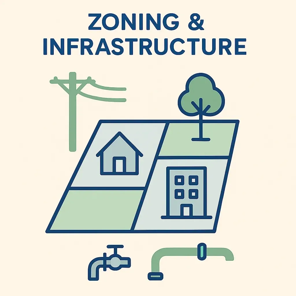 Zoning dictates dollars. Commercial and residential-zoned parcels fetch far more than agricultural land. And existing utilities are a massive value-add, saving buyers $15,000-50,000+ in infrastructure costs—money they'll happily factor into their offer.