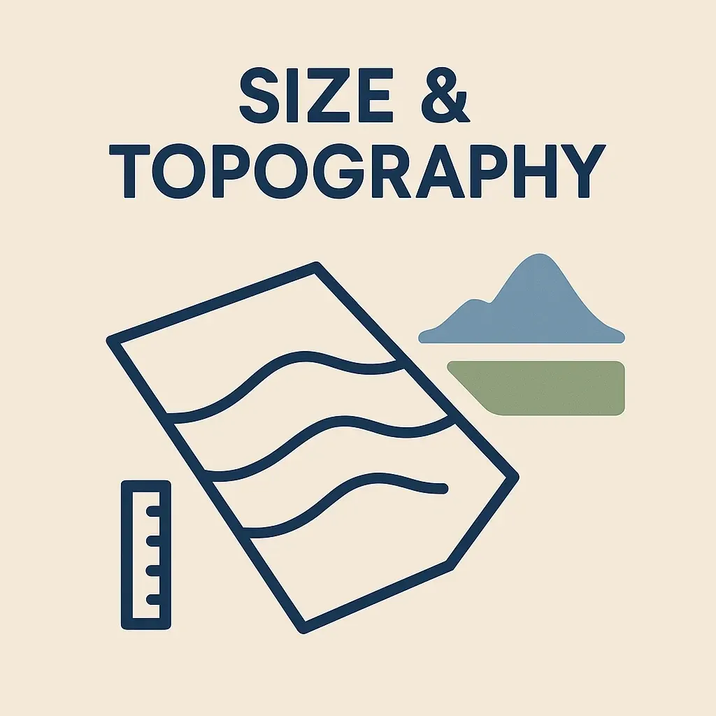 Size matters but not how you might think. Larger parcels sell for less per acre since fewer buyers can afford them. And the terrain is crucial flat, buildable land fetches significantly more than steep parcels where construction becomes a costly headache.